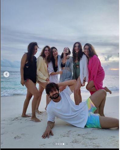 In the fourth picture, along with the girl gang, Vicky's brother Sunny Kaushal is seen posing on the ground wearing a white t-shirt and multi-coloured shorts.