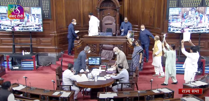 The protest was organised soon after the Upper House was adjourned till 12 amid Opposition ruckus.