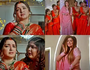 Sharing a glimpse of her song on social media, Aamrapali is seen dressed as a newlywed bride, wearing a bright Banarasi saree with golden motifs.