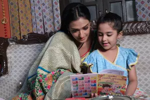 Mumbai, April 16 Aishwarya Khare, who plays mother of Trisha Sarda in the show 'Bhagya Lakshmi', has formed a great bond with the child actor and loves to help her with studies during their break.