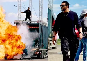 The second image showcased Rohit performing a death-defying stunt on a truck, with a car on fire emerging from it.