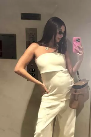 In a mirror selfie, Bieber, 27, can be seen showing off her belly and chic maternity style. She poses with her hand on her hip, wearing off-white, wide-leg pants and an elongated tube top set.
