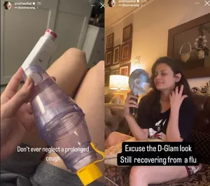 Sneha took to Instagram stories, where she shared a picture of the Spacer with MDI she is using to treat her cough. The instrument is a plastic tube that attaches to a metered dose inhaler (MDI) to help deliver medicine to the lungs.