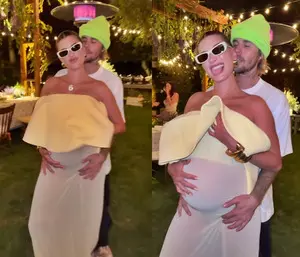 In the reel, Justin is seen standing behind Hailey, lovingly holding her blossoming baby bump, while she gently strokes her belly.