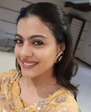 The photo shows Kajol wearing a yellow ethnic suit, with her hair half-tied.