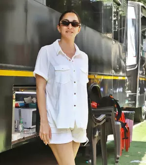 The actress was papped at the Filmalaya Studios in the Andheri area of Mumbai on Saturday. The actress posed for the paparazzi in front of her vanity van. She opted for an all white summer outfit as the maximum city gears up for an intense bout of summer with Saturday temperature clocking at a blistering 35°C after the departure of a short breezy period.