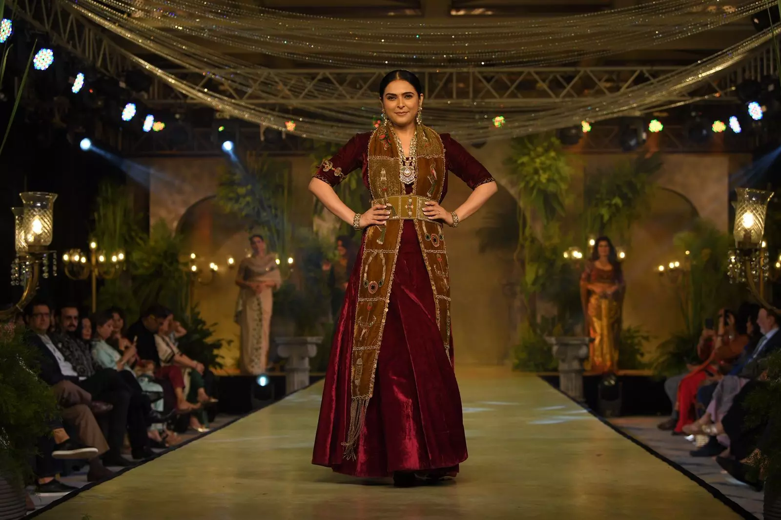 Dressed in a deep maroon velvet ensemble, Madhurima carried a look that felt both rich and rooted. The outfit was elevated with a beautifully embroidered stole featuring intricate motifs, cinched at the waist with a structured belt that added definition. Her jewellery was traditional and statement yet balanced, complementing the outfit without overpowering it. The overall styling reflected elegance with a strong cultural identity.