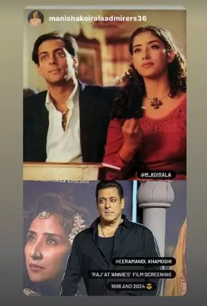 Manisha took to Instagram and re-shared a post from her fan club featuring a picture of herself and Salman from the film, directed by Sanjay Leela Bhansali, and a photograph of the 'Dabangg' actor from the premiere.