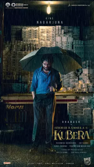 It showcases senior actor Nagarjuna standing in a downpour with an umbrella and an air of mystery. He is surrounded by trucks of liquid cash, symbolising the film's title 'Kubera'.