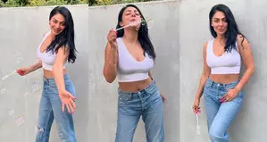 In the images, the actress is seen dressed in a white crop top paired with blue ripped jeans.
