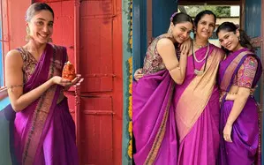 To celebrate Ganesh Utsav, Sharvari channeled her Marathi mulgi as she wore a bright purple kanjeevaram saree. She shared the pictures on her Instagram, where she is seen posing with her mother in the saree, playing with her dog and also holding a small idol of Lord Ganesha.