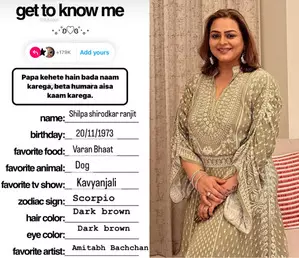 The snap reads as: "Get to know me... name: Shilpa Shirodkar Ranjit, birthday: 20/11/1973, favourite food: Varan Bhaat, favourite animal: dog, favourite TV show: Kavyanjali, Zodiac sign: Scorpio, hair color: dark brown, eye color: dark brown, favourite artist: Amitabh Bachchan."