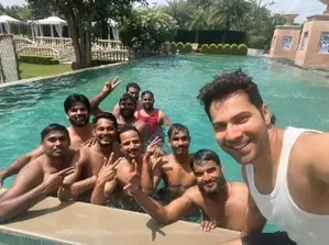 Taking to his Instagram Stories, Varun, who has 46.7 million followers on his Instagram account shared a fun-filled selfie with his ensemble art team members while enjoying the pool.