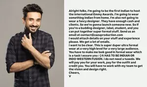 “You have to make me look good in formal wear which is a task I assure you. It HAS TO BE INDIAN OR INDO-WESTERN FUSION. I do not need a tuxedo. We will pay you for your work, pay for the outfit and credit you. You will have to work with my team to get the vision and design right. Cheers, V. “