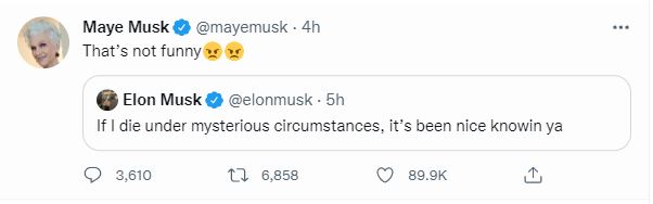 Elon's mother Maye responded with a stern warning for her son, quoting the tweet and saying, "That's not funny!" To which, Elon Musk replied, "Sorry! I will do my best to stay alive."