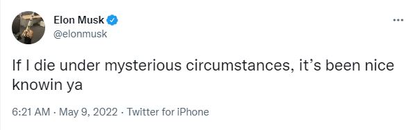"If I die under mysterious circumstances, it's been nice knowin ya," tweeted Musk.