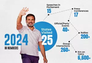 "In 2024, Rahul Gandhi visited 25 states undertaking a yatra of over 6,600 km. He held more than 260 group interactions, addressed more than 200 public rallies and attended over 40 party events. He gave 15 speeches in Parliament and addressed 17 press conferences," it said.