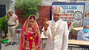 Voters lined up at the polling station in a queue in ward-9 of Kathua town were pleasantly surprised when they saw Aseem Mangotra and wife Vaishali in wedding dress turn up at the polling station.