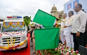The event, titled ‘Chief Minister's Emergency Transport Service: Launch of 65 New Ambulances,’ was held on the steps of Vidhana Soudha in Bengaluru.