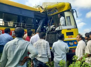 The accident led to a traffic jam for up to four kilometres on the Narsapur-Sangareddy road. Police arranged a JCB and a crane to remove buses from the road.