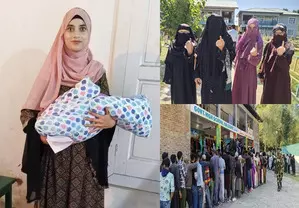 Visuals shared by the poll panel showed long lines of voters, both men and women, standing patiently to exercise their franchise and posing enthusiastically afterwards with their ink-marked fingers. A family, which had brought along a toddler and a boy, posed proudly in Kishtwar after voting, while a mother came in to vote in Kishtwar, carrying her swaddled child.