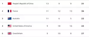 France, however, jumped to second place with 11 golds and 12 silver and 13 bronze for a total of 36 medals. Australia meanwhile, slipped to third with a total of 22 medals, including 11 golds.