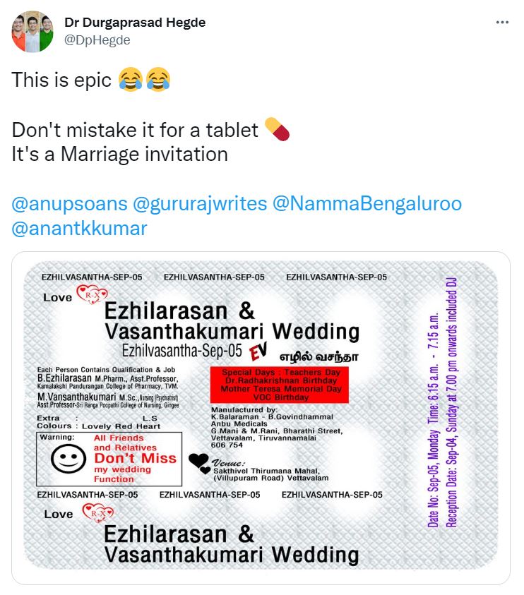Tamil couple's viral 'tablet strip' themed wedding invite leaves internet in splits
