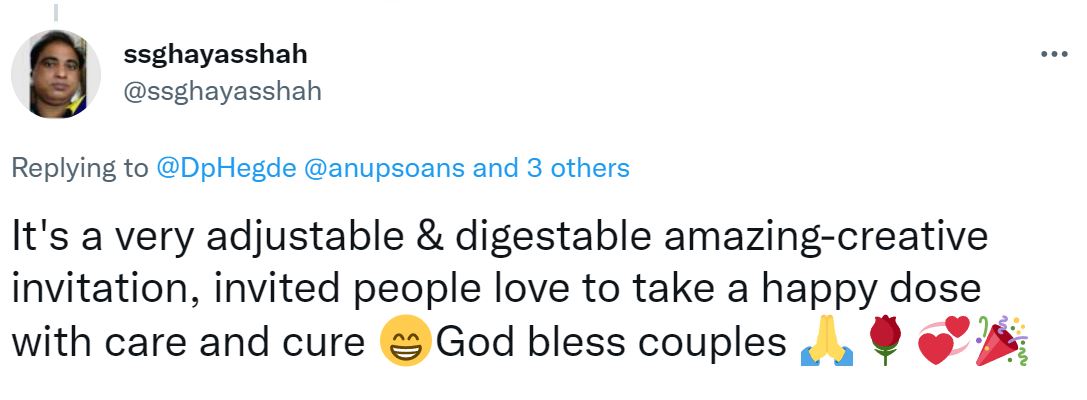 Another one wrote, "It's a very adjustable & digestable amazing-creative invitation, invited people love to take a happy dose with care and cure. God bless couples."