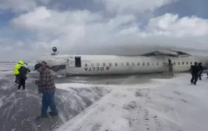 The Delta flight flying in from Minneapolis in the US lost one wing when it hit the runway, turned over on Monday afternoon, and lay on its back as the crew helped the passengers safely off the plane.